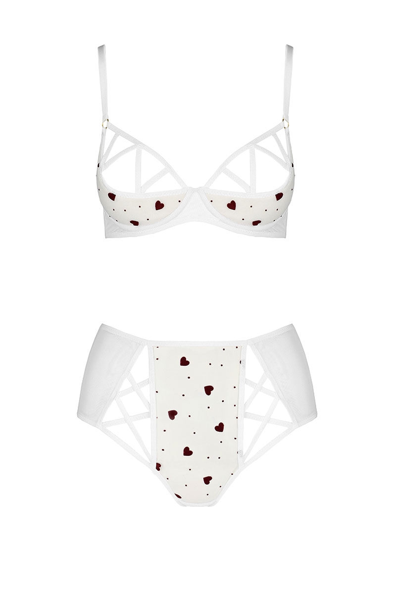 Bikini sexy en tulle blanc floqué de coeurs rouge foncé, tendre et coquin avec ses seins nus et sa culotte haute.