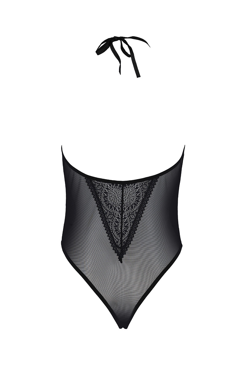 La finition string très échancrée possède une ouverture à l’entre-jambe avec un gousset à agrafes ajustable qui permet de régler la hauteur du body. Un triangle de dentelle pointé vers le bas des reins orne le dos et attire l’attention sur la beauté des fesses.