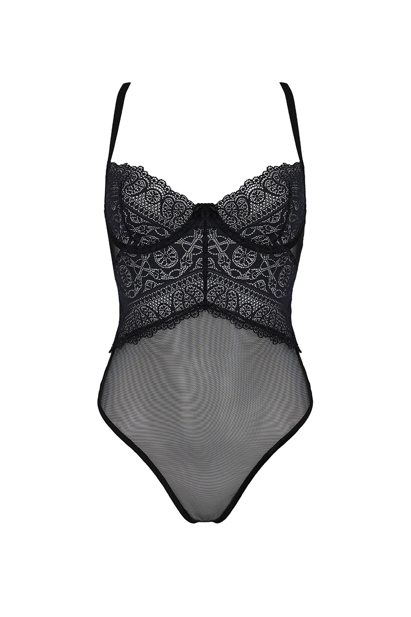 Le bustier en dentelle extensible est sculpté de riches motifs baroques originaux. Son soutien-gorge à armatures met particulièrement bien en valeur les seins, dont le galbe est souligné par la finition ondulée de la dentelle. Le corps de tulle finement ajouré apporte ses effets de transparence si séduisants sur le ventre et dans le dos.