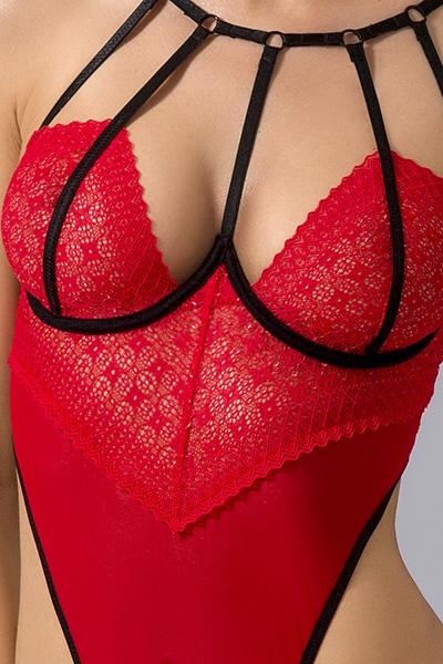 Un body sexy rouge vif avec ouverture intime, absolument irrésistible.