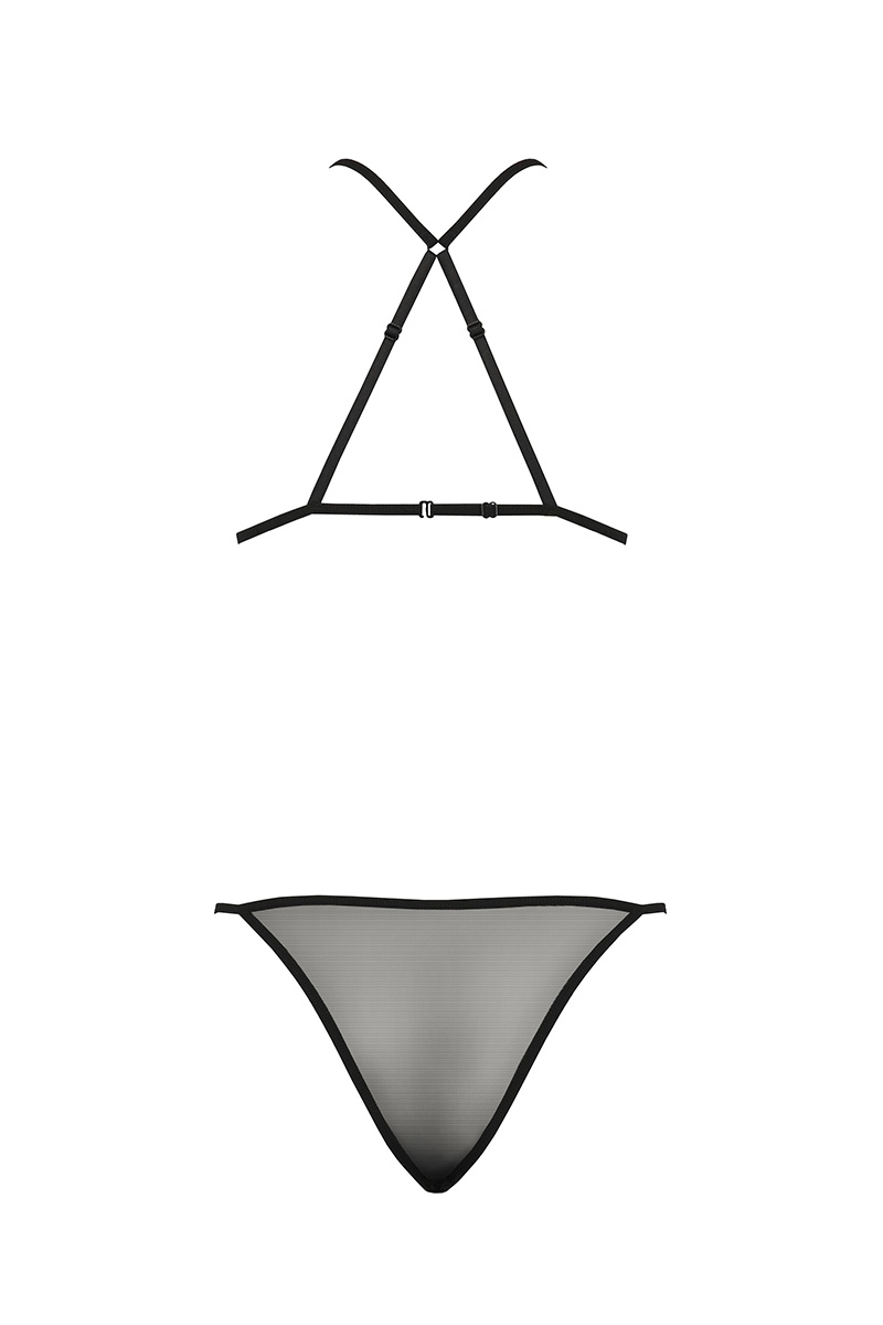 A larrière, des bretelles croisées réglables maintiennent la poitrine et la culotte en fine résille met en valeur les fesses.