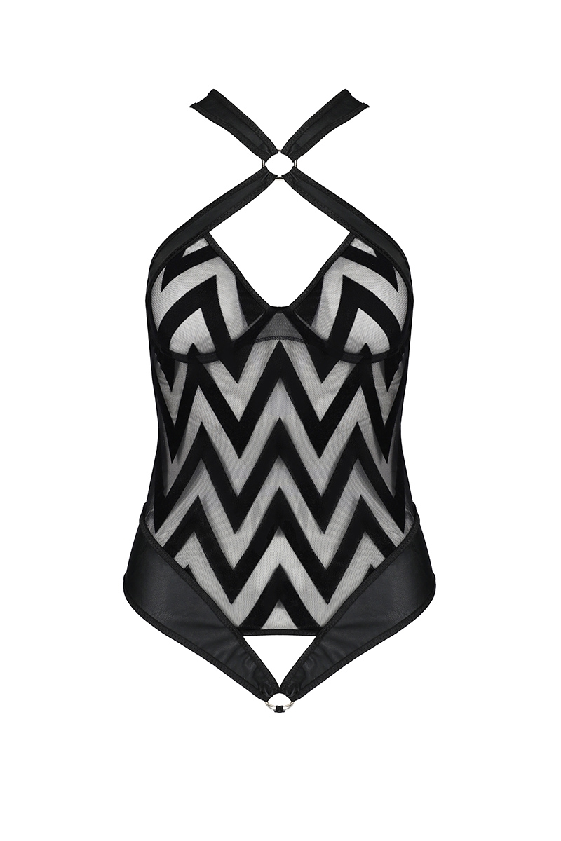 Ce body sexy noir Hina, en tulle transparent décoré de chevrons de velours et faux cuir mat fin et souple, est une lingerie élégante et osée.