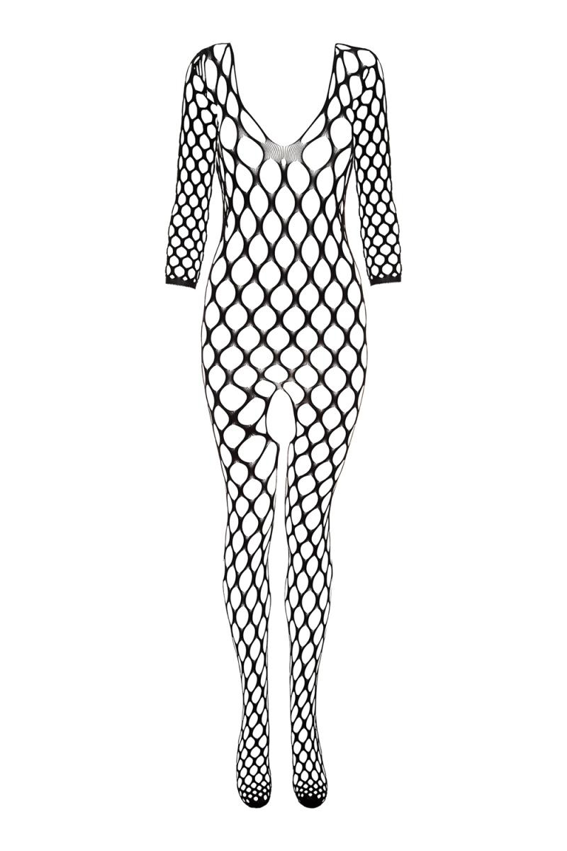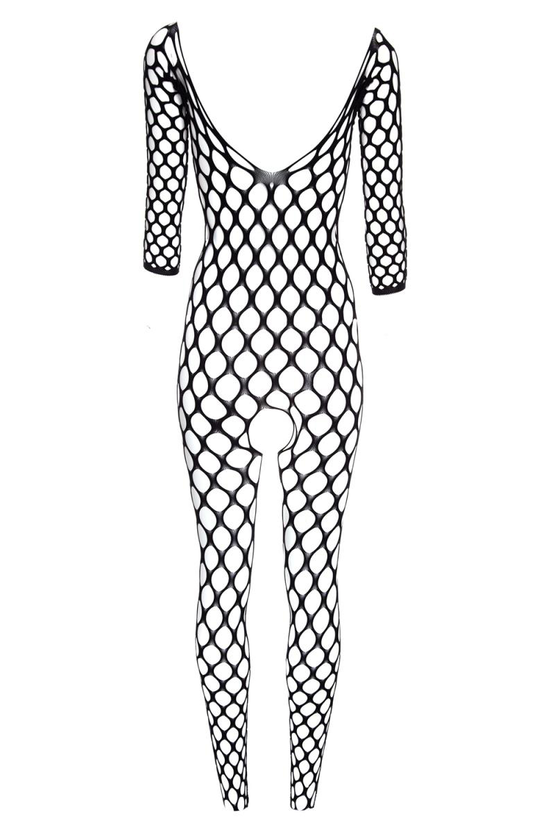 Une combinaison provocante en résille à large maille avec ouverture à l’entrejambe.