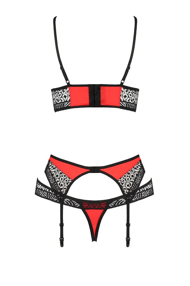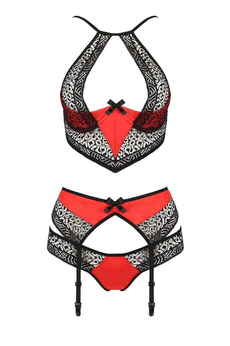 Ensemble lingerie dentelle composé d’un soutien-gorge, d’un porte-jarretelles et d’un string noir, par Passion.