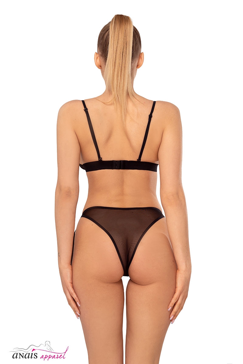 Cet ensemble en tulle noir se compose dun soutien-gorge de type brassière et dun string avec jarretelles intégrées.