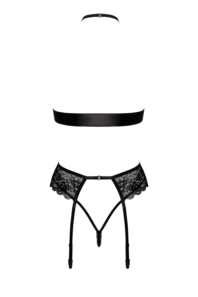Ensemble 4 pièces porte-jarretelles, string, tour de cou et ruban, en dentelle luxueuse et satin.