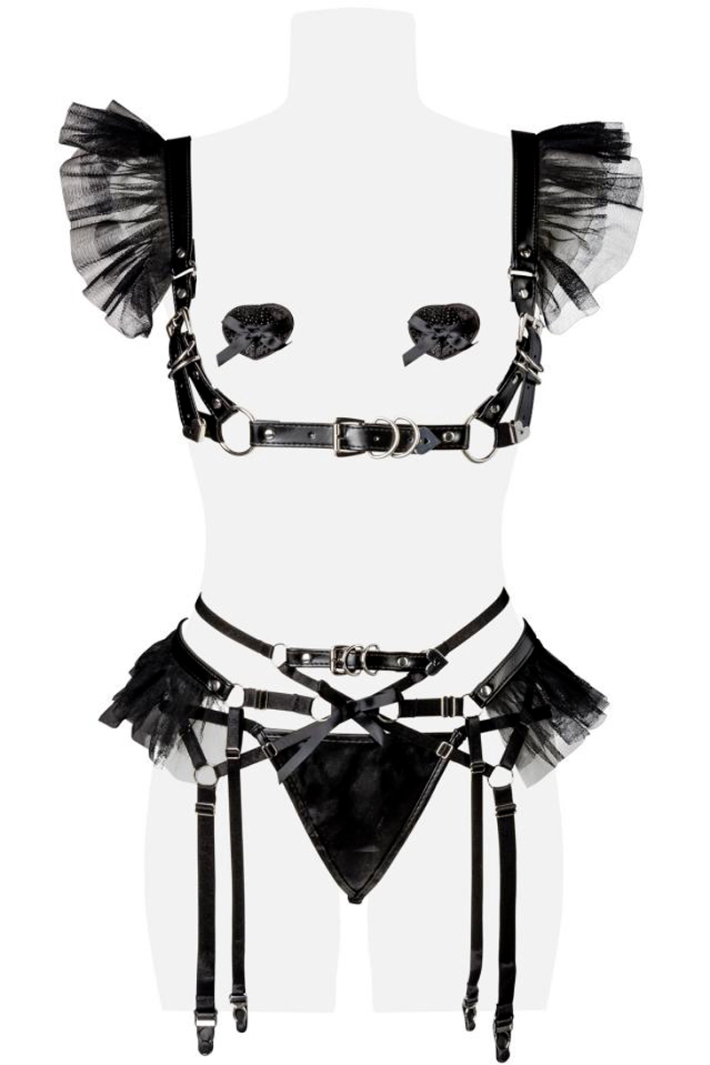 Lingerie fantaisie SM chic harnais seins nus, en faux cuir, anneaux chromés, et froufrous de tulle vaporeux.