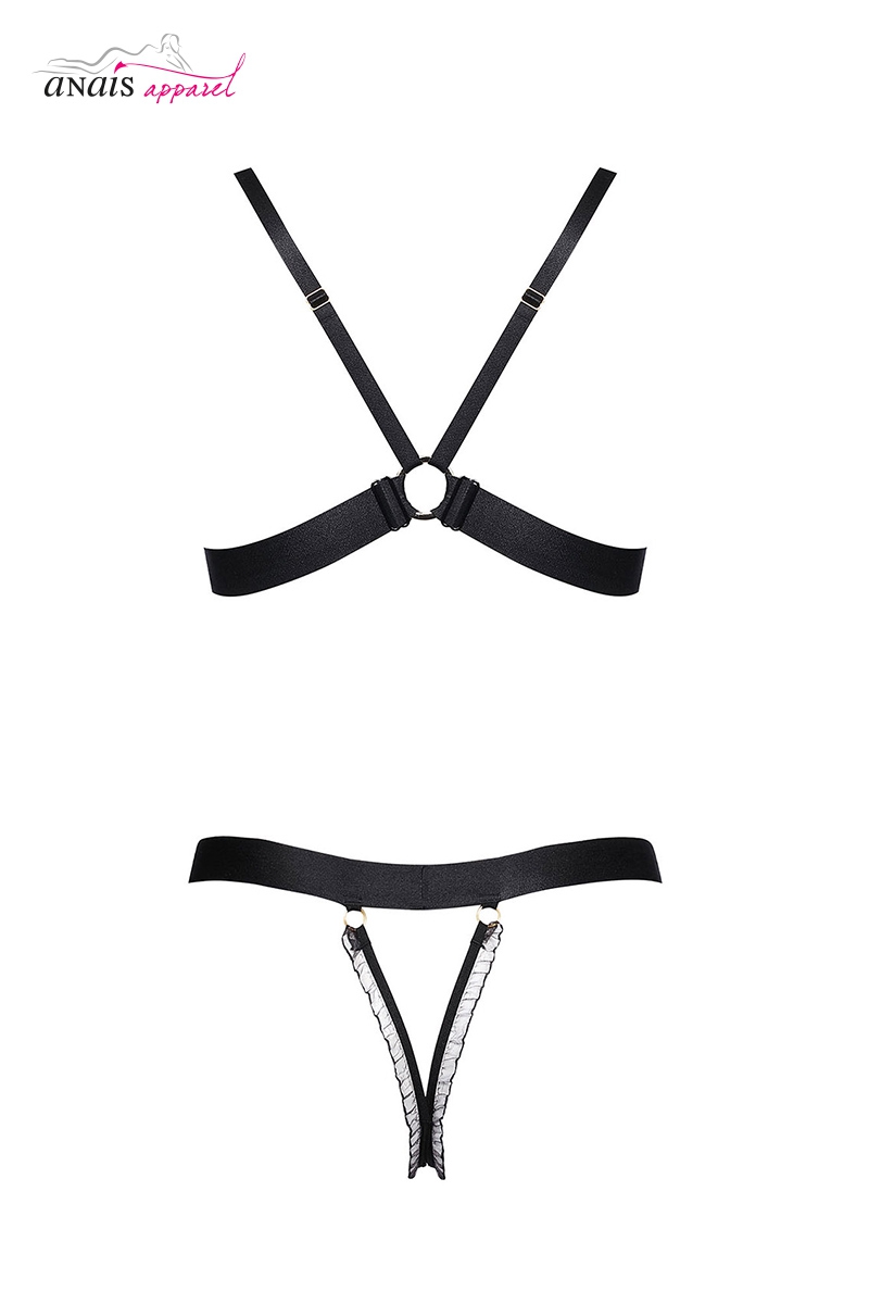 Ensemble lingerie sexy rouge style bikini, souligné de fronces noires.