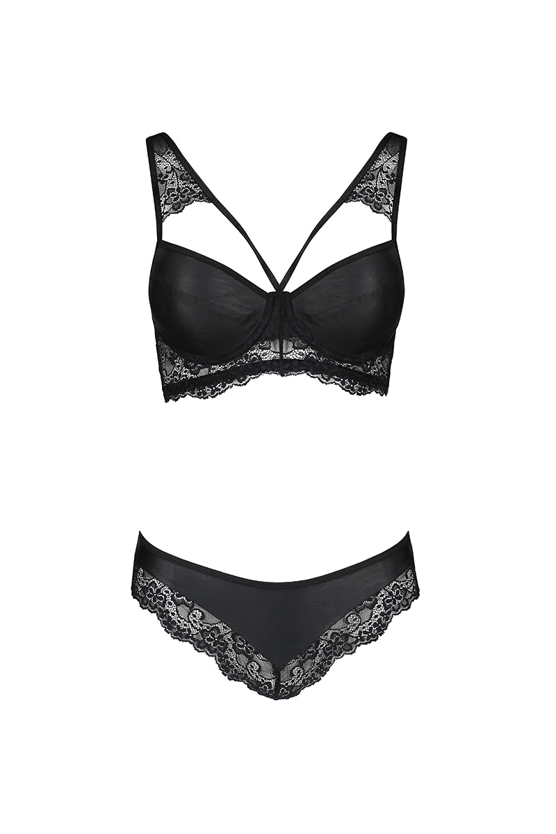 Ensemble de dessous coquins faux cuir et dentelle, composé d’un string tanga et d’un soutien-gorge, par Passion Lingerie.