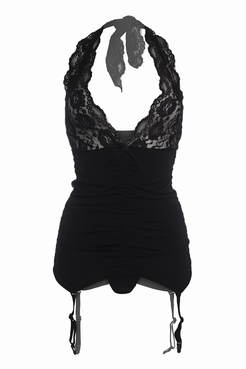 Cet ensemble se compose d’une guêpière et d’un string en dentelle avec gousset en coton.