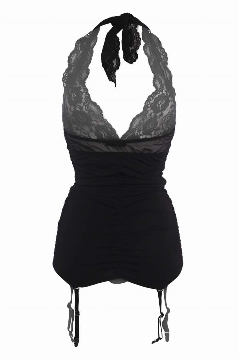 Conçue en matière souple et élastique la guêpière offre un ajustement confortable et une silhouette parfaite. Dos nu sur la partie haute, elle possède des côtés à smocks et des jarretelles amovibles, tandis que ses volants subliment vos courbes.