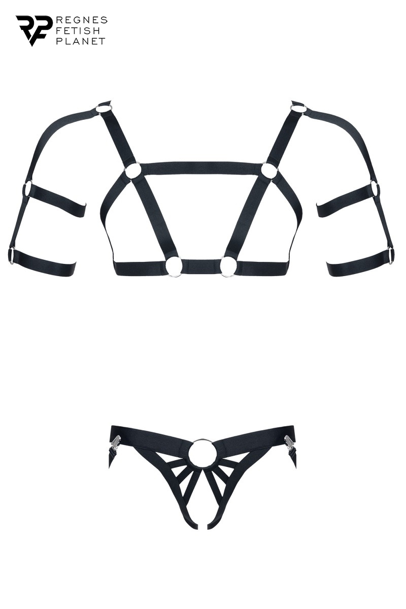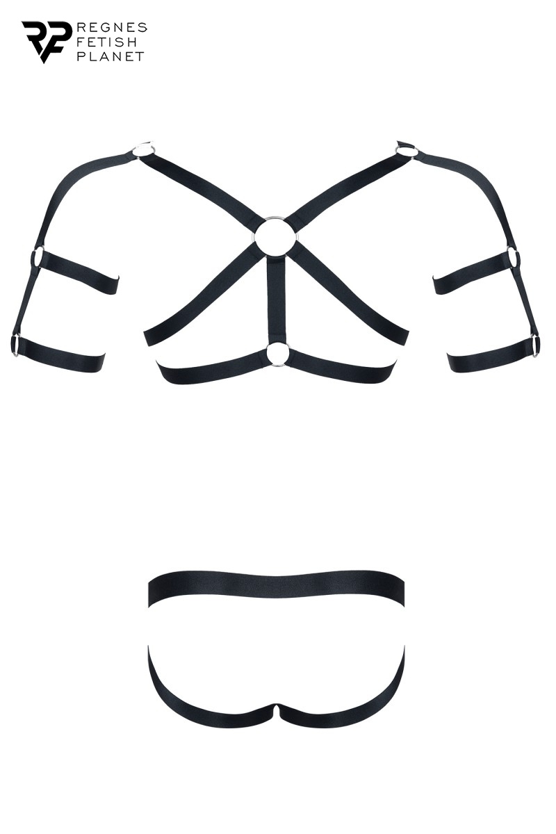 Harnais haut et jockstrap ouvert en lanières élastiques fabriqués par la marque Européenne Regnes.