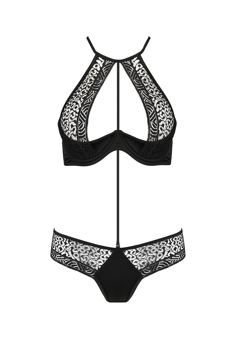 Ensemble de lingerie composé d’un soutien-gorge et d’un string en dentelle et tissu effet satin noirs, par Passion.
