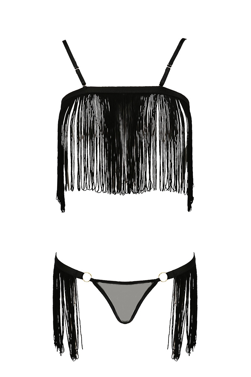 Le string réglable à larrière présente des franges sur les hanches rappelant le haut de la tenue. Le string dissimule lintimité grâce à un tissu en fin tulle noir et les hanches sont habillées par de fines franges noires.