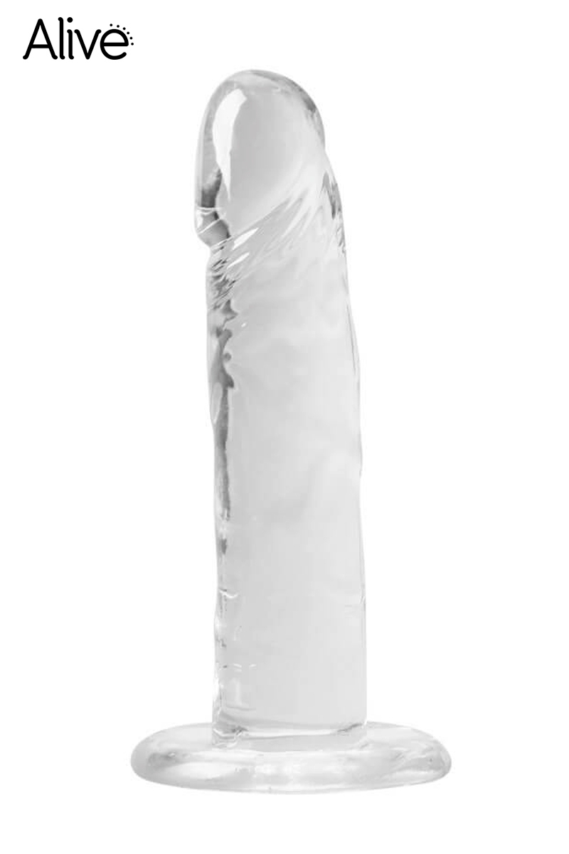 Gode ventouse translucide, en Jelly extra glissante et flexible, design réaliste, ventouse puissante, dimensions 14,7 x 3,7 cm.