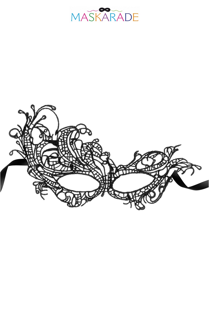 Masque noir en dentelle brodée souple avec une forme asymétrique, pour jouer à être quelqu’un d’autre, par Maskarade.