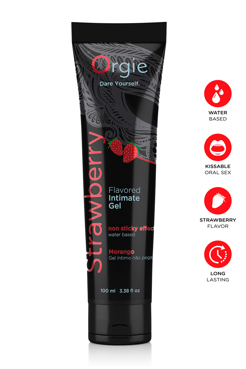Lubrifiant intime à base d’eau, longue durée, embrassable, délicieusement parfumé à la fraise.