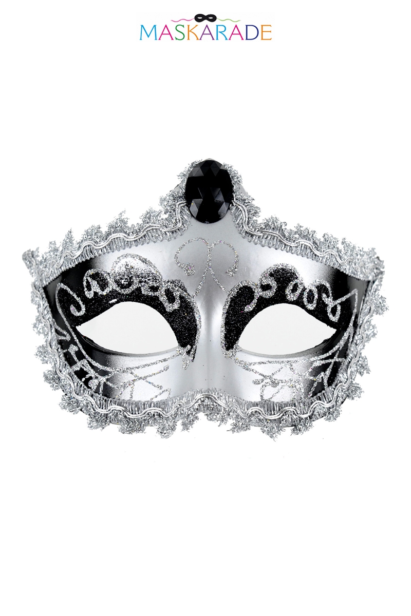 Loup argenté et brillant, avec bijou sur le front et bordure dentelle, pour se cacher tout en se montrant, par Maskarade.