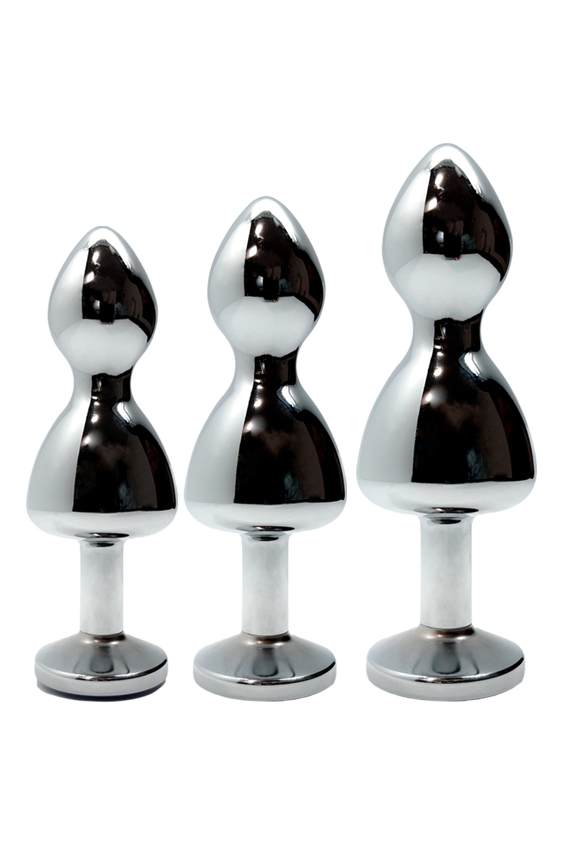 Plug anal / rosebud en métal 8,5 x 2,8 cm, avec double boule spéciale sensations et bijou strass rouge à sa base.