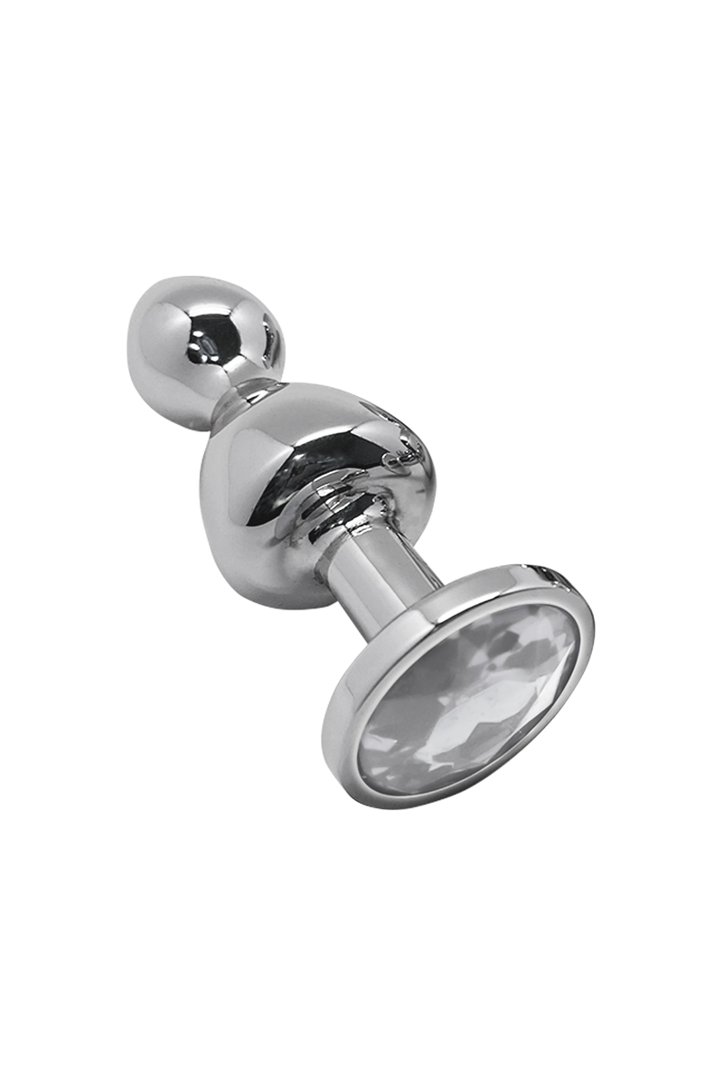 Plug anal / rosebud en métal 8,5 x 2,8 cm, avec double boule spéciale sensations et bijou strass transparent à sa base.