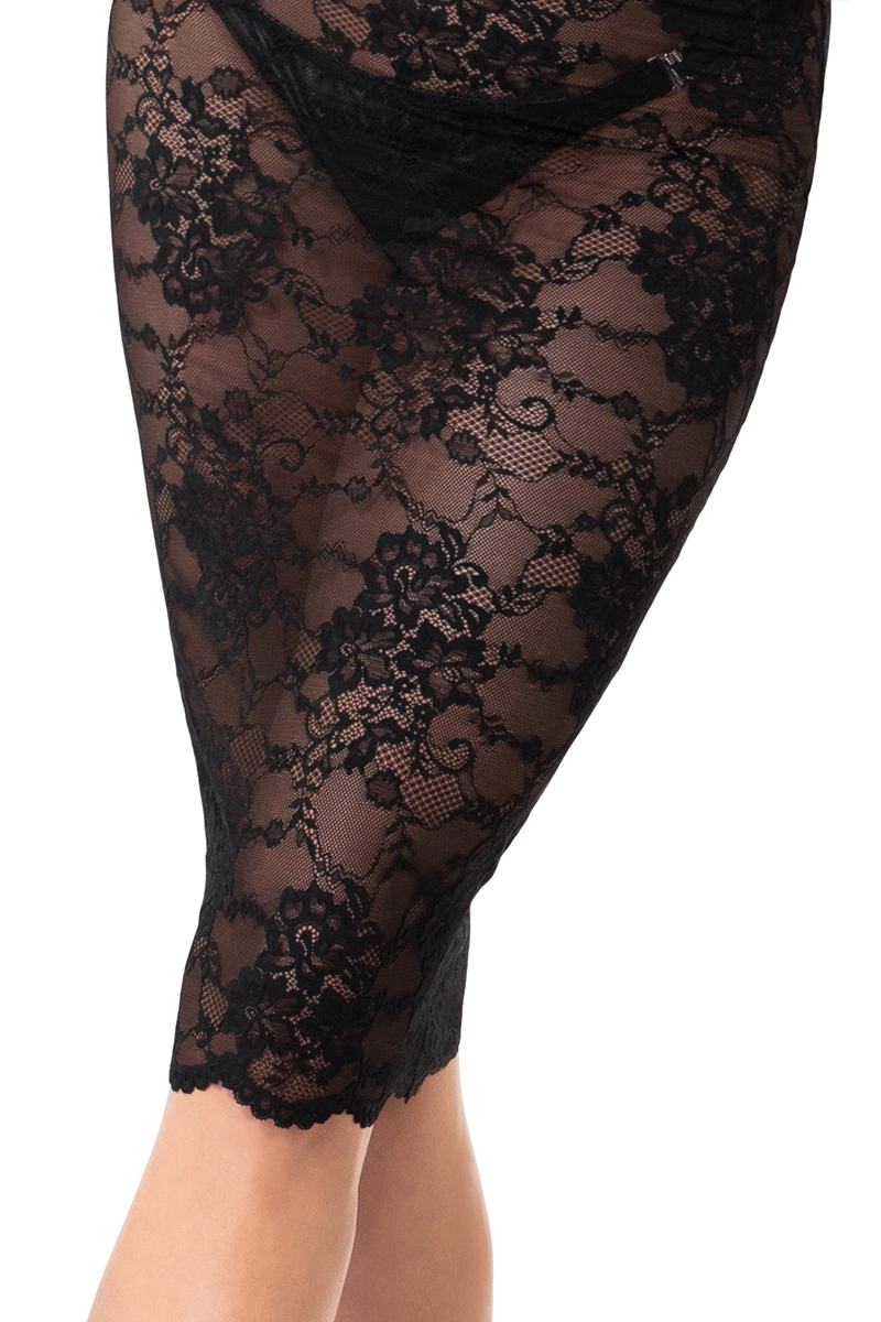 Cette robe en dentelle très douce et totalement transparente, est une tenue sophistiquée qui forme un fourreau impeccable sur la silhouette.