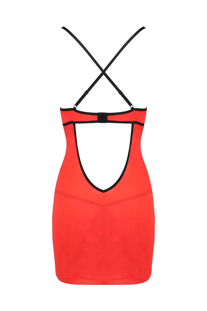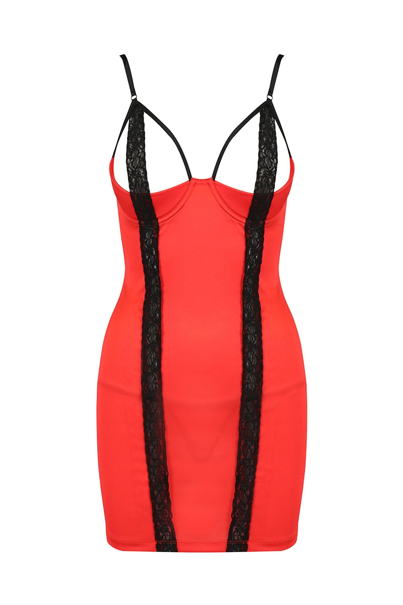 Robe sexy provocante en tissus rouge satiné souligné de dentelle noire, qui expose joliment la poitrine.