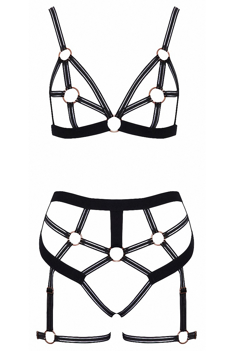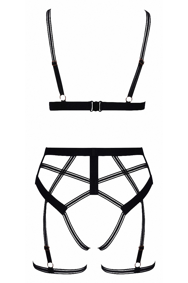 Ensemble lingerie harnais style BDSM composé d’un soutien-gorge et d’une culotte jarretière totalement ouverts.
