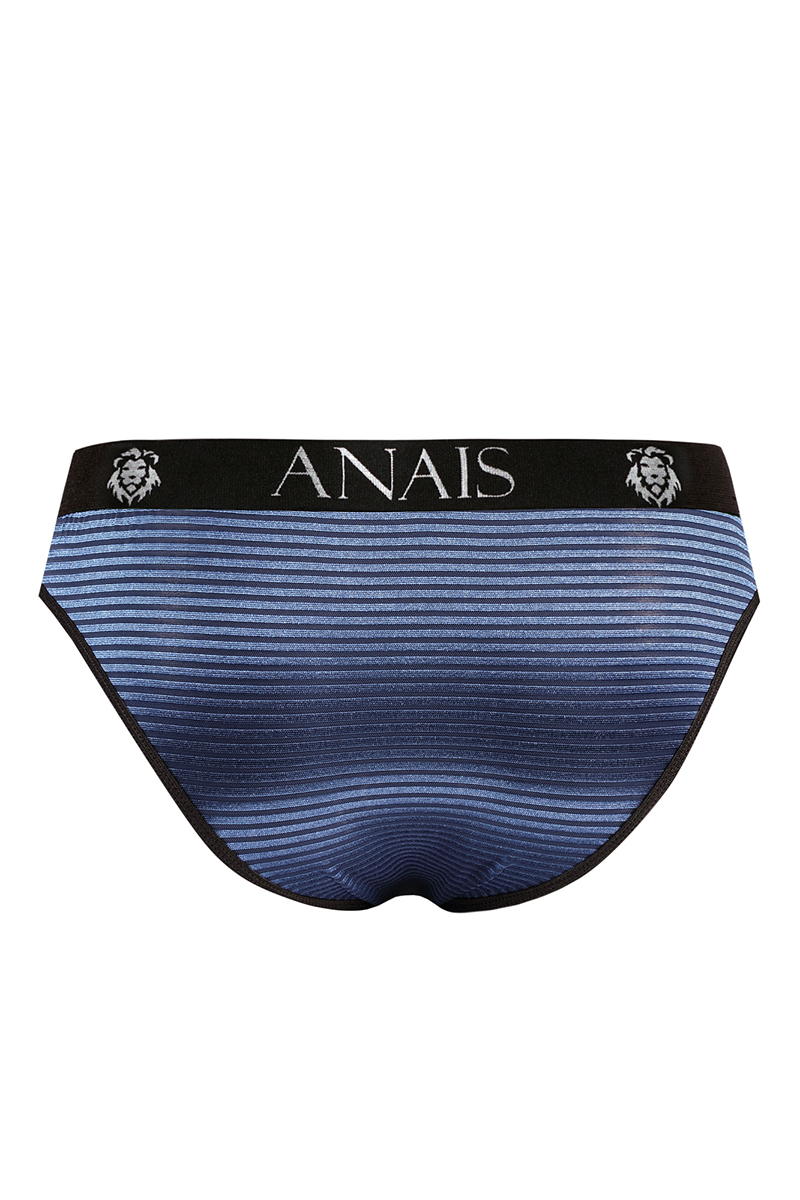 Slip sexy pour homme fabriqué en Tissu doux et élastique qui alterne entre rayures transparentes et rayures brillantes dun bleu profond par la marque Anaïs For Men en Europe