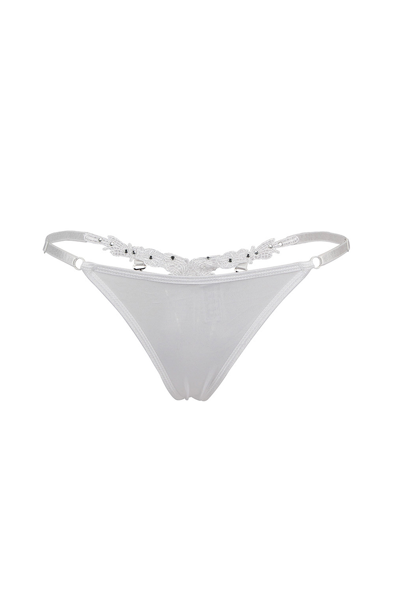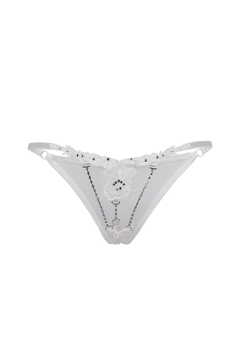 La marque Paris Hollywood nous présente ce string blanc ouvert à l’avant et décoré de strass, le summum du charme et de l’audace.