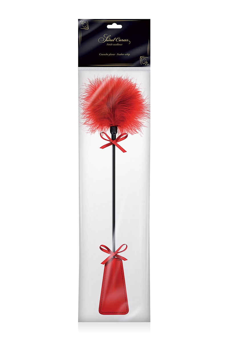 Cravache rouge très légère avec pompon en duvet à une extrémité, pour s’initier aux jeux de soumission en douceur.